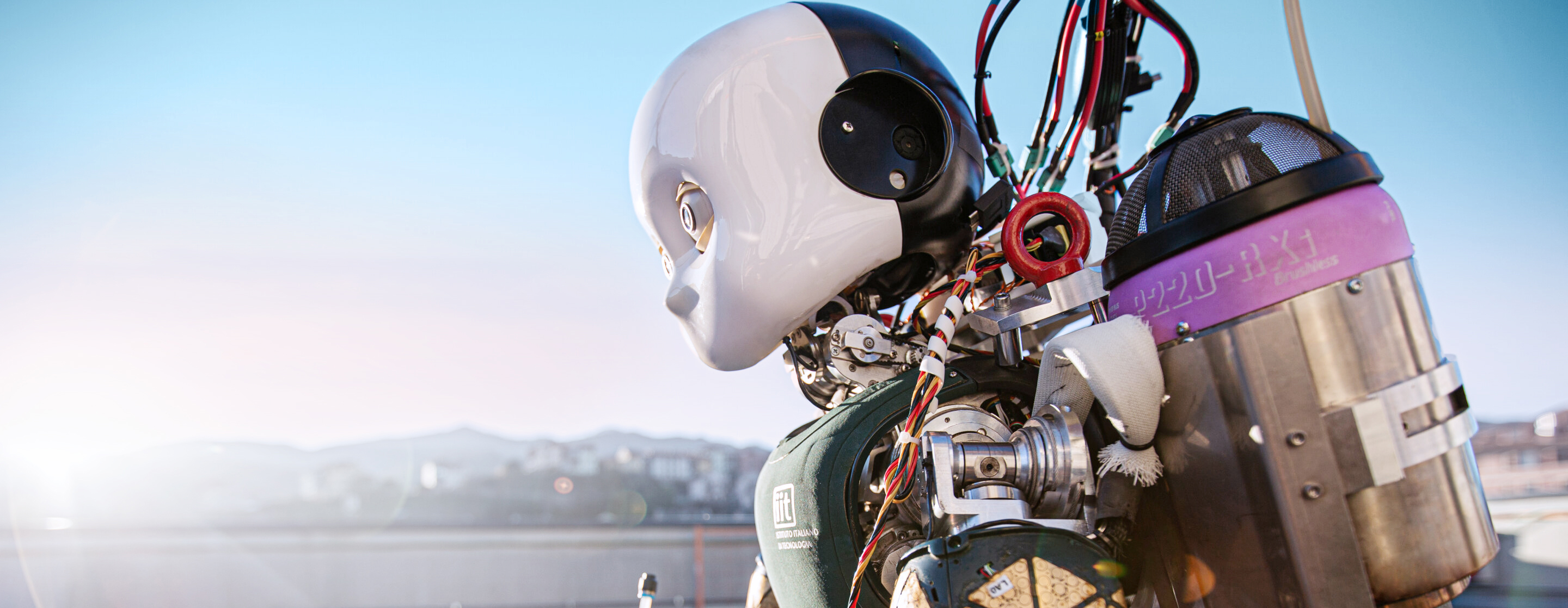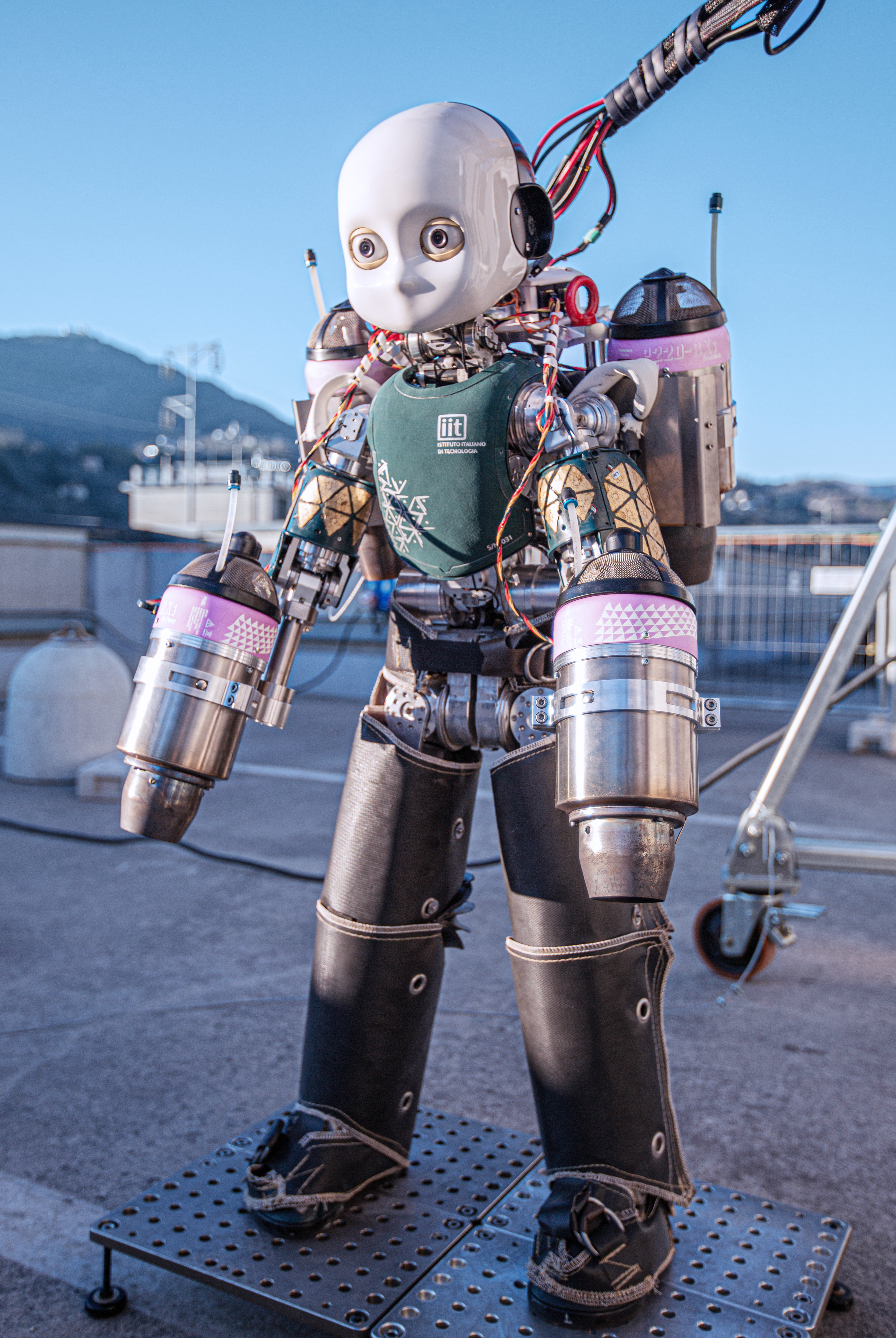 We have two prototypes of iRonCub, built on top of iCub v2.5 and v3.0. Both versions have four jet engines, two mounted on the arms and two on a jetpack attached to the robot’s back. Currently, experiments are carried out with iRonCub MK3.