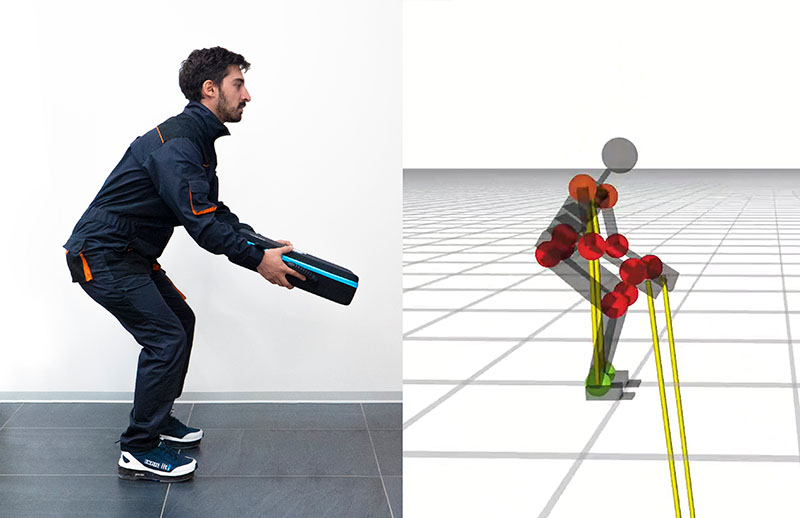 In tempo reale, l'intelligenza artificiale valuta gli sforzi articolari e le forze di compressione e di taglio (ad esempio, tra L5 e S1) sulla base delle informazioni provenienti dalla tuta e dalle scarpe sensorizzate, conoscendo l'altezza e il peso del soggetto.